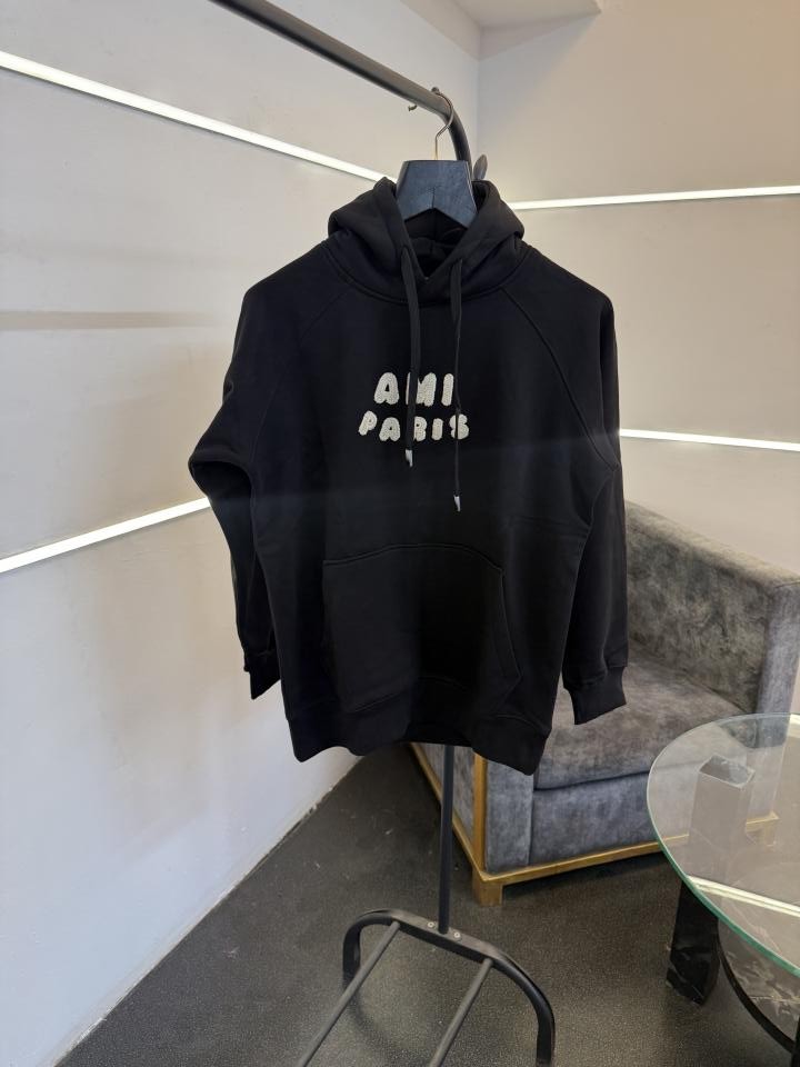 Ami paris oversize imported fleece hoodie with front embroidery branding black